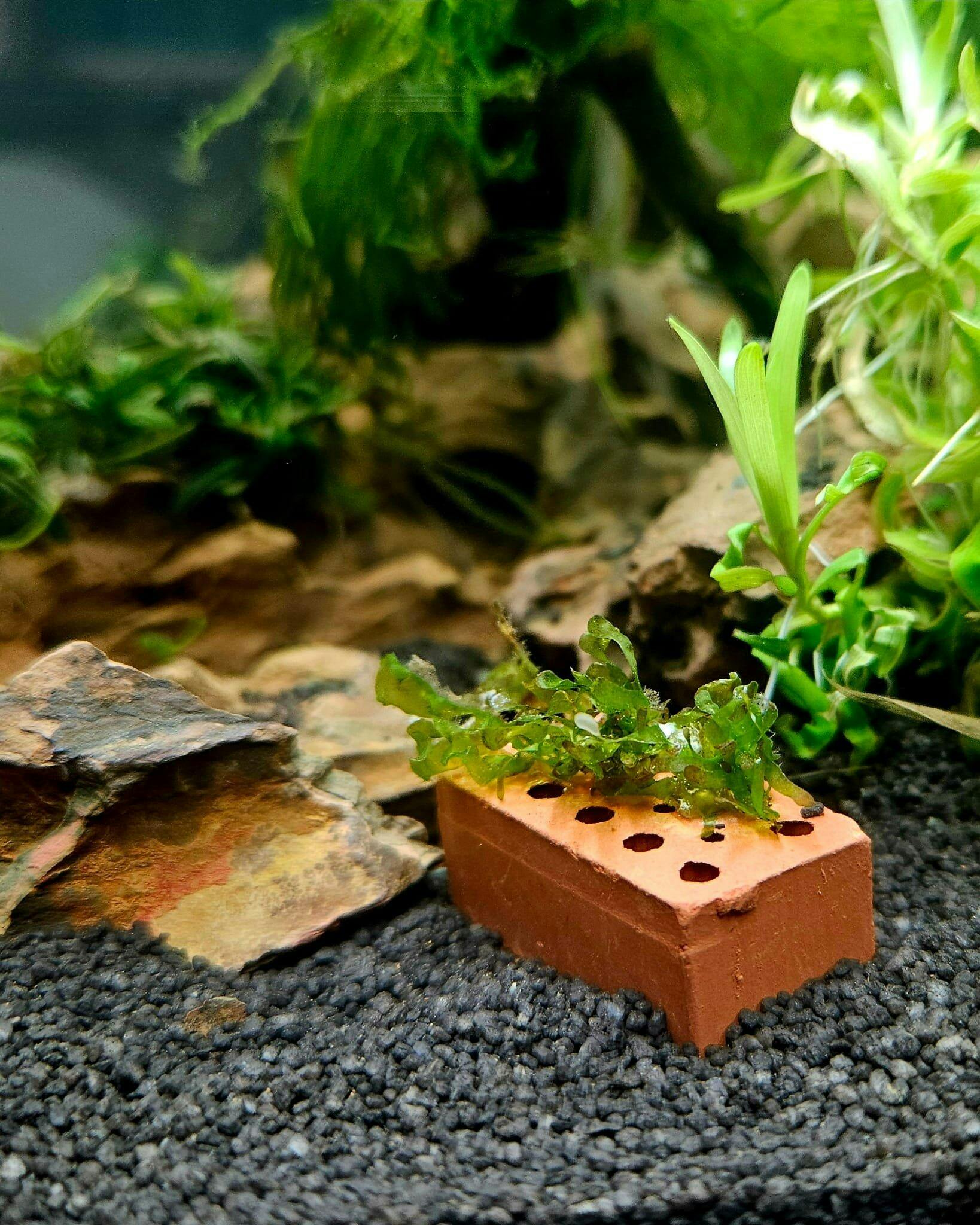 Die Backsteine eignen sich auch als Halterung für Garnelen Lollies und als Beschwerung / Anker für Hornkraut. Damit im Becken alles an Ort und Stelle bleibt.