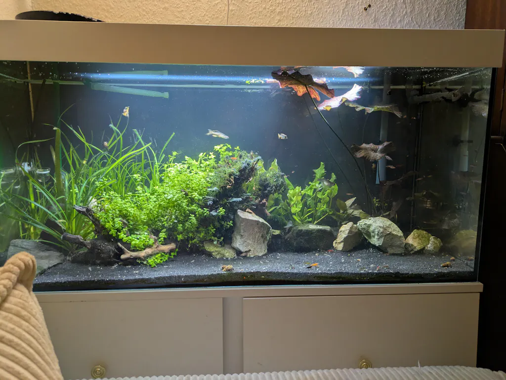 WICHTIG: Bitte vor jedem Wasserwechsel mit Leitungswasser das Wasser für mindestens 30 Sekunden aus dem Wasserhahn ablaufen lassen (kann man zum Gießen für den Garten nehmen). So wird das abgestandene Wasser (das etwas mehr Zeit hatte sich mit Kupfer und Schwermetallen zu sättigen) entfernt und landet nicht direkt im Aquarium.